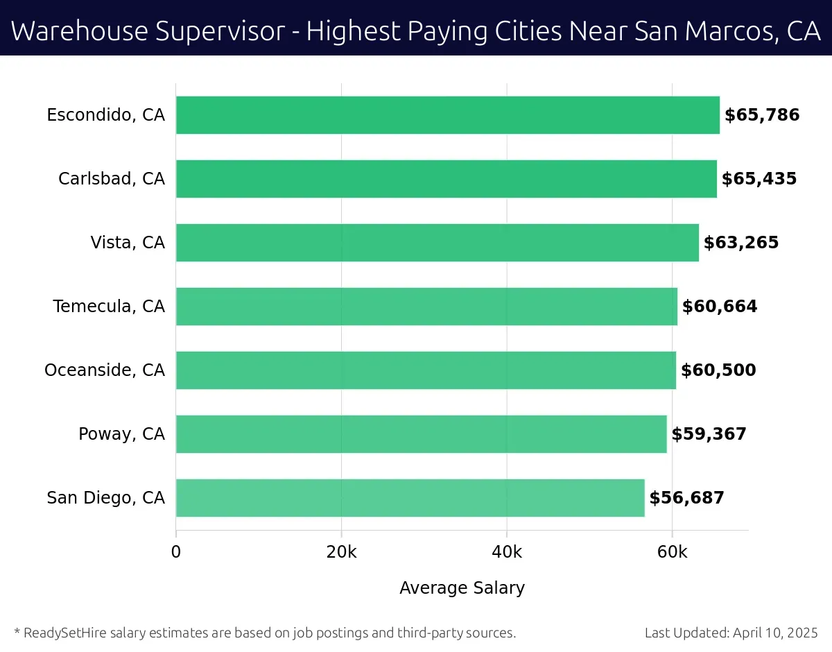 A Warehouse Supervisor in San Marcos, CA, can expect to earn a competitive salary. On average, these professionals make about $54,384 per year. Salaries can range based on experience and specific responsibilities. Most supervisors earn between $42,950 and $63,159 annually.