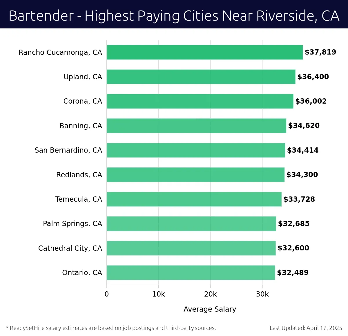 In Riverside, CA, bartenders can expect to earn a competitive salary. The average yearly salary for bartenders in this area is around $34,096. This figure provides a good starting point for those considering a career in this field. Bartenders often have the opportunity to earn additional income through tips, which can significantly boost their earnings.