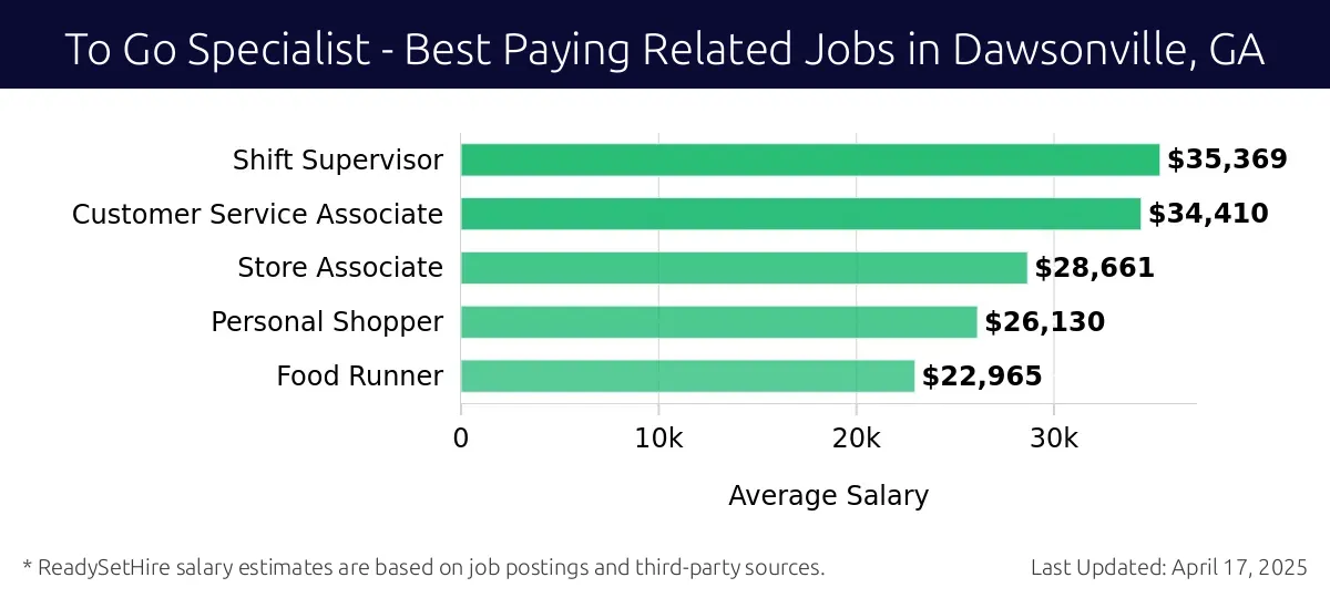 A To Go Specialist in Dawsonville, GA, earns a competitive salary. On average, they make around $21,926 per year. This figure can vary based on experience, skills, and the specific employer. Many To Go Specialists find that their earnings increase with more experience in the field.