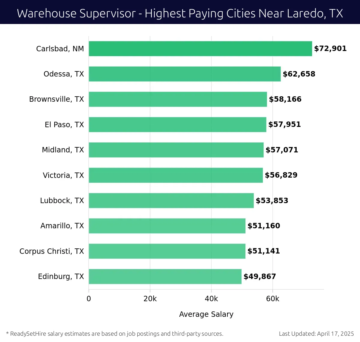 What are the highest paying cities for a Warehouse Supervisor near Laredo, TX?